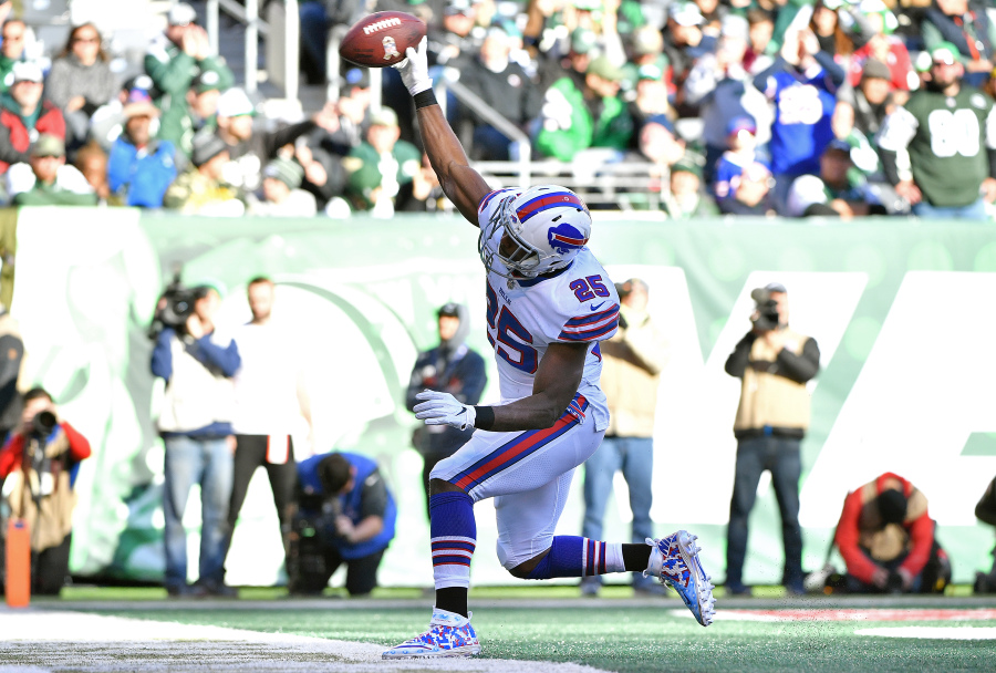 EAST RUTHERFORD, NEW JERSEY – NOVEMBER 11: LeSean McCoy #25 of the Buffalo Bills scores a first quarter rushing touchdown past Marcus Maye #26 of the New York Jets at MetLife Stadium on November 11, 2018 in East Rutherford, New Jersey. (Photo by Mark Brown/Getty Images)