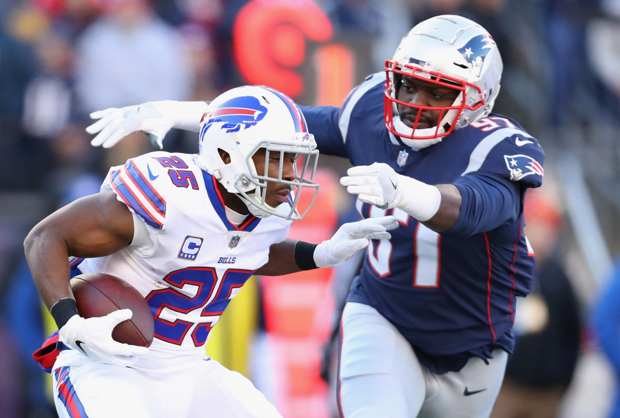 FOXBOROUGH, MA – DECEMBER 23: Ufomba Kamalu #97 of the New England Patriots attempts to tackle LeSean McCoy #25 of the Buffalo Bills during the first half at Gillette Stadium on December 23, 2018 in Foxborough, Massachusetts. (Photo by Maddie Meyer/Getty Images)