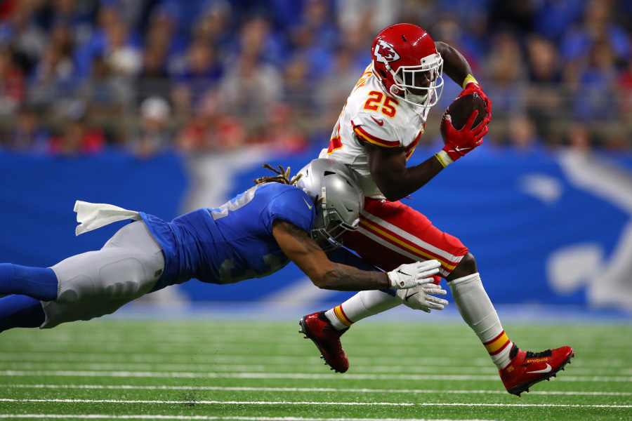 DETROIT, MICHIGAN – SEPTEMBER 29: LeSean McCoy #25 of the Kansas City Chiefs runs the ball against Mike Ford #38 of the Detroit Lions in the first quarter of the game at Ford Field on September 29, 2019 in Detroit, Michigan. (Photo by Gregory Shamus/Getty Images)