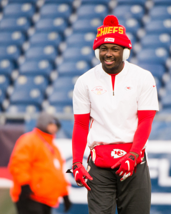 FOXBOROUGH, MA – DECEMBER 8: LeSean McCoy #25 of the Kansas City Chiefs warms up prior to the start of the game against the New England Patriots at Gillette Stadium on December 8, 2019 in Foxborough, Massachusetts. (Photo by Kathryn Riley/Getty Images)