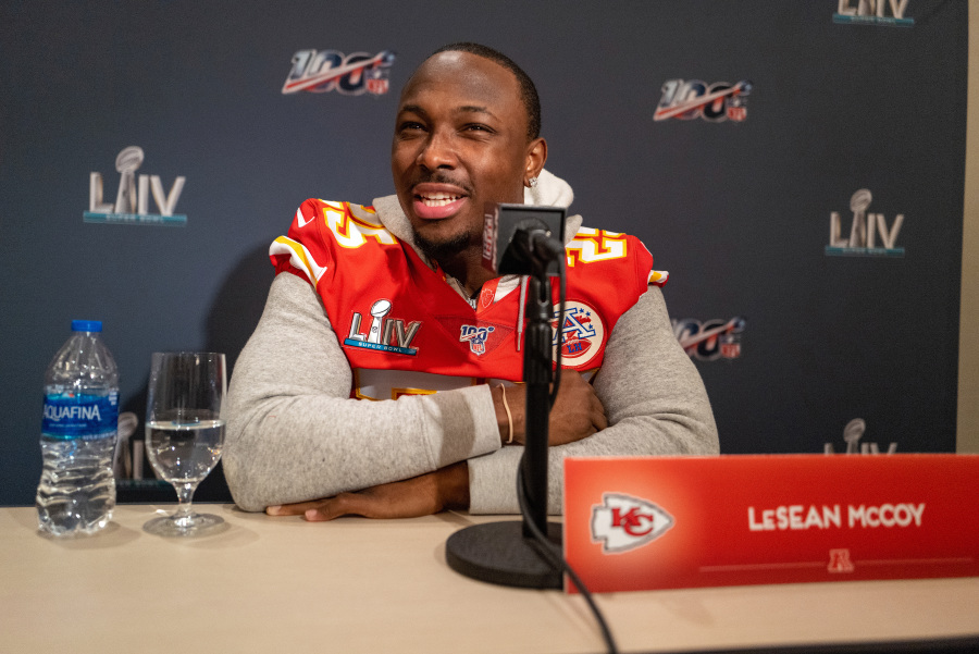 AVENTURA, FLORIDA – JANUARY 29: LeSean McCoy #25 of the Kansas City Chiefs speaks to the media during the Kansas City Chiefs media availability prior to Super Bowl LIV at the JW Marriott Turnberry on January 29, 2020 in Aventura, Florida. (Photo by Mark Brown/Getty Images)