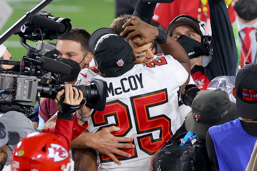 TAMPA, FLORIDA – FEBRUARY 07: Tom Brady #12 and LeSean McCoy #25 of the Tampa Bay Buccaneers embrace after winning Super Bowl LV at Raymond James Stadium on February 07, 2021 in Tampa, Florida. (Photo by Kevin C. Cox/Getty Images)