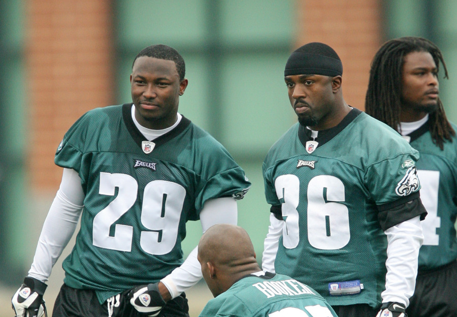 PHILADELPHIA – MAY 1: Running back Brian Westbrook #36 (R) stands on the sideline with second round draft pick running back LeSean McCoy #29 of the Philadelphia Eagles during minicamp at the NovaCare Complex on May 1, 2009 in Philadelphia, Pennsylvania. (Photo by Hunter Martin/Getty Images)