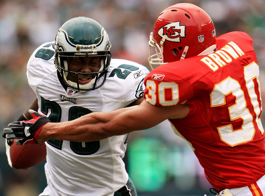 PHILADELPHIA – SEPTEMBER 27: LeSean McCoy #29 of the Philadelphia Eagles tries to break free from Mike Brown #30 of the Kansas City Chiefs during their game on September 27, 2009 at Lincoln Financial Field in Philadelphia, Pennsylvania. (Photo by Travis Lindquist/Getty Images)